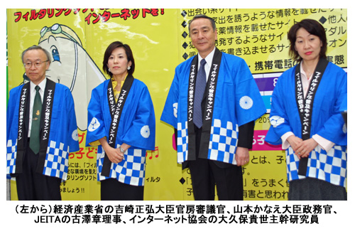 今回のキャンペーンは、経産省やJEITA、警察省などの官庁や業界団体が共同で実施。インターネットの有害サイトから子どもを守るためにソフトを使った「フィルタリング」を行うことの有効性を親に訴えて利用を促進する。