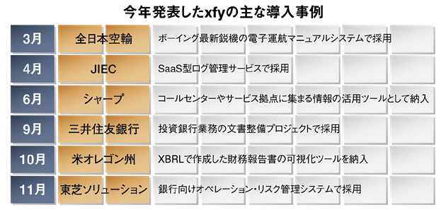 苦戦続きだったが、追い風は吹いている。内部統制の強化で業務文書の記録管理が強く求められていること。もう一つは、企業や団体の財務諸表をXBRL(財務会計用のXML文書)で記述する動きが世界的に広まっていることだ。国内でも、今年4月から電子開示システムがXBRL対応となり、企業の財務諸表はXBRL形式での提出を義務づけられることとなった。米国ではXBRL形式の財務諸表データを多次元分析し、投資判断に役立てる大規模なプロジェクトが進む。これに先立ち、米オレゴン州では多次元データ分析用にxfyを先行的に採用。今後、オレゴン州を手本に「各州でxfyを採用することも十分考えられる」と、手応えを感じている。国際会計基準の標準化も進んでいることから、北米などの海外では主にXBRL関連を軸にxfyビジネスの継続・拡大を目指す。