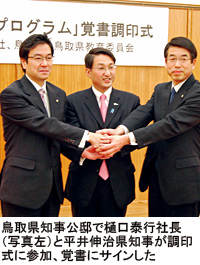 マイクロソフト(樋口泰行社長)は、社会貢献活動の一環として展開する地方支援制度「地域活性化協働プログラム」の対象として鳥取県を選定、3月下旬に樋口社長と平井伸治県知事が覚書調印式を行った。地元ITベンチャーのビジネス支援や高齢者向けITスキル育成サポートが内容で、マイクロソフトが無償で全面支援する。 「地域活性化協働プログラム」でマイクロソフトが支援する都道府県は、今回の鳥取県で3県目。すでに佐賀県、高知県を同プログラムでサポートしており、今後、青森県および徳島県と協業する。鳥取県は47都道府県中、人口が最も少なく、今も減少中で高齢化も進む。県には、ITの利用促進で地域活性化に結びつけたい狙いがある。平井県知事は、「鳥取県は情報ハイウェイが整備され、教職員のPC環境に対する取り組みも早かった。ケーブルテレビネットワークのカバー率も90%を超えている。ただ、そのインフラの利活用が課題」と説明。協業によるIT利用の活発化を期待している。