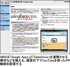 ゼネラル・ビジネス・サービス(GBS、木田晴夫社長)は、クラウドビジネスを本格的に拡大させる。クラウドサービスと顧客企業の既存システムとのつなぎ込みなどのシステム構築(SI)や、研修サービスなどを柱とするもので、今年度(2009年12月期)は、クラウド関連ビジネスで50案件ほどの受注を見込む。取り扱う商材は、グーグルの情報共有サービス「Google Apps」、CRM(顧客情報管理)の「Salesforce(セールスフォース)」、今年夏をめどに日本IBMがサービスを始める「LotusLive(ロータスライブ)」の三つ。Salesforceは、大手SIerが相次いで販売パートナーに加わるものの、Google AppsやLotusLiveは、これから拡大が見込める分野だ。「他社に先駆けて取り組む」(高野孝之・取締役専務執行役員)ことで先行者利益を狙う。