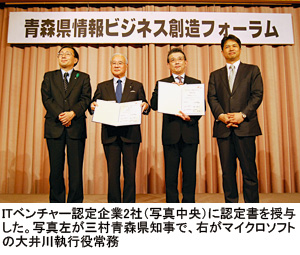 マイクロソフト(樋口泰行社長)は、ITベンダー向けイベント「青森県情報ビジネス創造フォーラム」を青森県などと主催した。マイクロソフトが社会貢献活動の一環として推進する「ITベンチャー支援プログラム」の今年度認定企業を発表。県内ITベンチャーのシンクとページワンを選出し、認定証を授与した。同プログラムで支援する都道府県は、佐賀県、高知県、鳥取県に次いで4番目になる。 イベントは、地域社会貢献活動に積極的なマイクロソフトのITベンチャー支援内容や、ITビジネスモデルの研究成果を紹介し、県内の情報産業活性化を促進するために開催したもの。青森県とマイクロソフト、青森県情報サービス産業協会が主催した。青森県は、情報インフラは整備されているものの、インターネットの利用率が47都道府県中最も低く、ITの利活用が課題になっている。昨年度から2か年計画で情報産業を戦略的創造事業に選定、県内でのIT事業活性化を図っている。