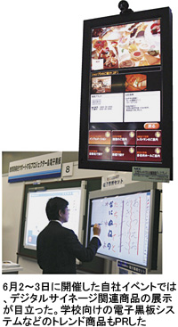 6月2~3日に開催したディスプレイやプリンタ、映像・ドキュメント関連ソリューションの展示するNECの独自イベント「ディスプレイ・ドキュメント フェア2009」では、デジタルサイネージ関連商品を中心に展示。自治体やホテル向けなど、業種や用途別に最適なデジタルサイネージ製品・システムを配置してPRした。このほか、プリンタやプロジェクタ、学校向けの電子黒板などを揃えてアピールした。
