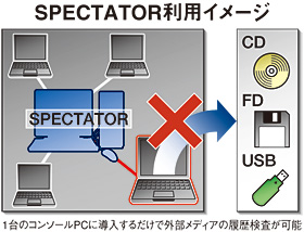 「SPECTATOR Device Control」は一つのコンソールPCにのみ導入し、社内のクライアントPCにはエージェントをインストールせず、PC1台につき2秒程度で外部記録メディアの使用履歴を取得。監査結果をウェブ形式の分析レポートで表示する。(鍋島蓉子)