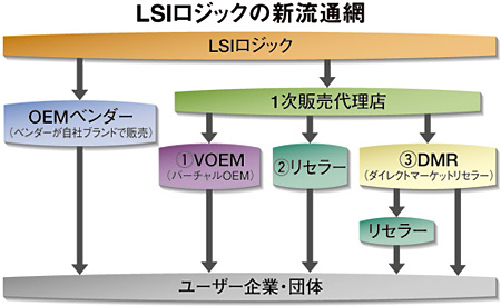 従来のOEMビジネスは継続しながら、別に1次販売代理店を組織し、その傘下に(1)VOEM(バーチャルOEM)(2)リセラー(3)DMR(ダイレクトマーケットリセラー)という3種類の販社を設置する体制をつくった。「VOEM」とは、LSIロジック製品を自社ブランドとして販売するITベンダー。「リセラー」はユーザー企業に直接販売するパートナー企業の総称で、「DMR」はユーザー企業ほか再販するITベンダーにも製品を販売するパートナー群。すべて1次販売代理店から製品を調達する体制を敷いた。