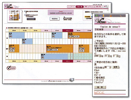 「Venus」は予約、顧客、店舗、スタッフの管理機能とメールの自動配信が備わった「総合管理システム」。パソコンだけでなく、携帯電話とFAXでの利用が可能だ。「顧客管理」では顧客ごとのカルテや来店顧客の管理などのほか、顧客からの予約をインターネットを介して受け付け、確認メールを送信できる。このほか、クーポンやメルマガの発行といったリピート率を向上させる機能や、来店頻度を分析して「来店予測」や「リピート率」を導き出すこともできる。