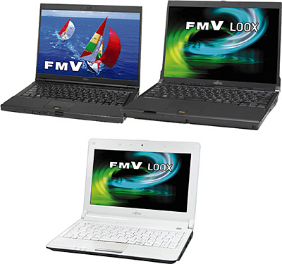 富士通が個人向けに09年夏モデルで発売したモバイルノートPC(写真上、左から)「FMV-BIBLO MG」「FMV-BIBLO LOOX R」とネットブック「FMV-BIBLO LOOX M」