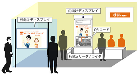 今回、実験を行うのはauショップ池袋東口(豊島区)とauショップ光が丘IMA(練馬区)の2店。実験では店内に情報配信用ディスプレイ2台を設置。各店舗の設置状況に合わせた店内・店外に設置したディスプレイで来店客に向け、auの携帯電話サービスやコンテンツ情報などを配信する。
