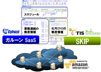 また、AmazonEC2環境で展開する社内SNS「SKIP」を「ガルーン SaaS」とセットで提供し「ガルーン SaaS」のポータルに「SKIP」の新着情報を表示する機能連携を行う。