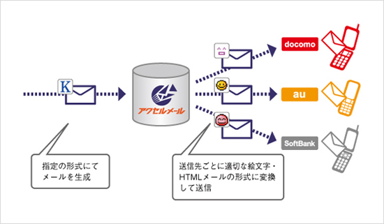 携帯3キャリア向けに絵文字やHTMLメールを自動変換して送信するオプション機能。絵文字変換では、携帯アドレス宛てのメールの場合、指定されたタグを送信キャリアごとに絵文字に差し替えるとともに、携帯アドレス宛て以外のメールの場合は、指定されたタグを空白に置き換える。また、デコレーションメール変換では、携帯アドレス宛てメールの場合、送信先キャリアごとに適切なMINE構造で送信できるようにする。