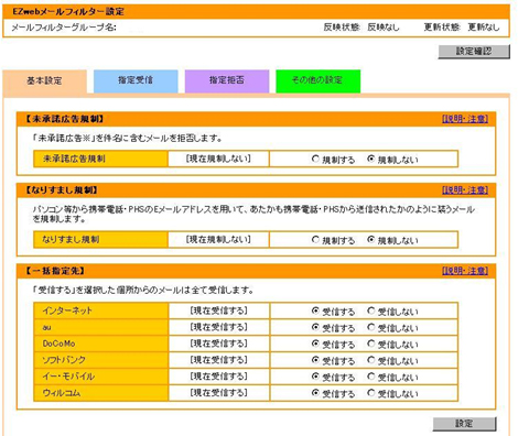 また、複数のau携帯電話をグループとして管理でき、グループごとにメール受信ポリシーを設定すれば、部署ごとに異なるメール受信ポリシーを適用することも可能。グループは最大99まで設定できる。利用実態に合わせ、受信ポリシーを設定することで、不要なメールを受信拒否できるため、パケット通信料の削減につながるという。