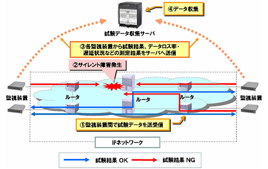 富士通とドコモは、障害検出の試験データを送受信する監視装置間でやりとりされたすべてのデータから、回線エラーなどで通信途中に消失したデータ量の割合や遅延状況などを測定。IPネットワークでのデータ送受信結果と合わせて分析することで、早期の検出を可能にした。
