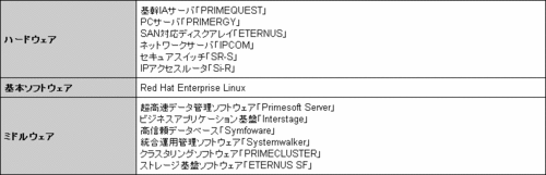 システムは、富士通の基幹IAサーバー「PRIMEQUEST」やPCサーバー「PRIMERGY」などのハードウェアと、OSにLinux、ミドルウェアにビジネスアプリケーション基盤「Interstage」、データベース「Symfoware」などで構成する。
