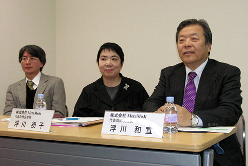 社名の「MetaMoJi」には、文字(モジ)をベースに築かれてきた人々の思考やコミュニケーションを進化(メタ)させる」という意味合いを込めたという。浮川夫妻は1979年にジャストシステムを創業。2009年10月に同社取締役を退任してMetaMoJiを立ち上げた。ジャストシステムで十分な収益を上げられなかったことについては、「(過去の)総括にはまだ時間がかかる」と、言葉を濁した。新会社では、ジャストシステムのようなパッケージソフトの販売は行わない方針で、XMLなど得意技術をテコに“事業会社の立ち上げ”を主な役割としている。