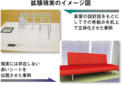 写真はCADデータをもとに、正確な家屋の骨組みを机の上に立体的に描写したものと、現実には存在しない赤いシートをあたかも存在しているかのように映し出した例。いずれも現実空間にバーチャルデータを持ち込むARの技術を応用したもので、「ユーザー企業の関心度は高く、すでに事業化の一歩手前まで来ている」(村浩二・次世代ソリューション開発センター長)と、手応えを感じている。これにVRや3Dネットの技術などを融合。オフィスや学校教室の“ユビキタス・プレイス”化を推進する。