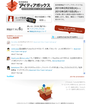 09年10月に、「電子政府」のテーマで「アイディアボックス」を利用した意見募集の実証実験を行ったところ、約70万のアクセス、1706の投稿、7041の投票があった。また、アメリカでは、ホワイトハウスが国民からの意見募集に利用しているという。