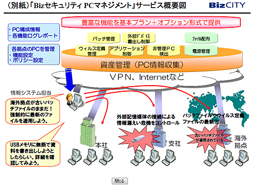 「Bizセキュリティ PCマネジメント」は、PCのセキュリティ対策と資産管理業務を統合し、低コストで運用するクラウド型PC管理サービス。統合メニューを提供するほか、資産情報をベースにした端末ごとのセキュリティ対策を網羅的に実施する。