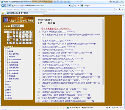 「六法全書復刻版」は、昭和32年から平成20年版まで52年分を収録。すべてをPDF化し、書籍そのままを参照できるようにした。全法令の通し検索に加え、「法令名索引検索」「年版総目次検索」「条数特定検索」など、多彩な検索方法を用意する。