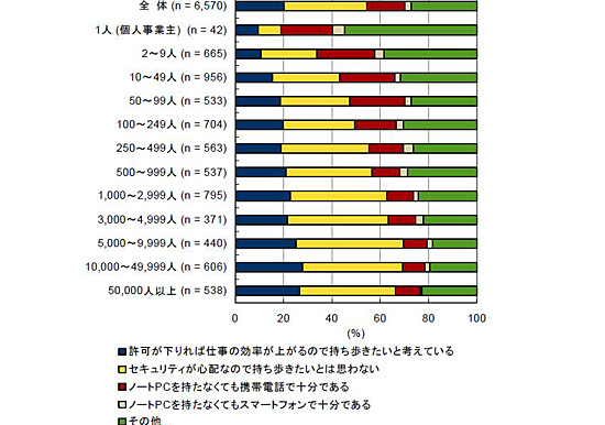 ノートPCの活用では、「生産性が50%以上向上した」と答えたのが全体の6割を超えたものの、社外にノートPCを持ち出して活用するユーザーは全体の約2割にとどまっている現状が明らかになった。PCを持ち歩かない主な理由は、「セキュリティが心配」「携帯電話やスマートフォンで十分」などが挙がった。