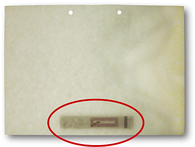 積層ICタグを活用した重要書類用紙の一例。後ろから光を当てると、ICタグが透けて見える