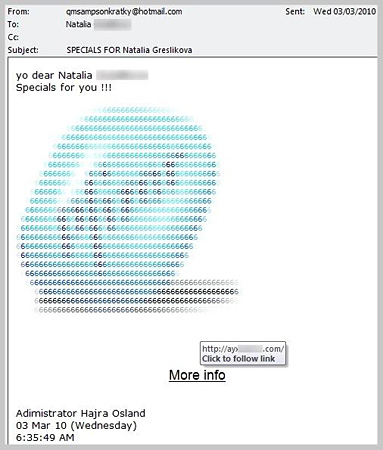 メッセージラボは、世界的に著名なマルウェアとスパムの専門家が在籍する「MessageLabs Team Skeptic」を有し、毎日数十億件のウェブページ、電子メール、インスタント・メッセージ(IM)の監視を行っている。それによると、ここ数年、アスキーアートがスパムメールに利用される傾向があるという。サイバー犯罪者は、アートを使うことにより文字を読みにくくし、ベーシックなアンチスパム技術のキーワード検索をすり抜けようとしているのだ。