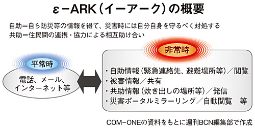 また、金沢大学の研究者とは大規模自然災害が起きたときに市民や公的機関の情報共有を可能にするシステム「ε-ARK(イーアーク)」の開発を進める。普段使っている携帯電話やメール、インターネットなどの既存のITインフラを使い、災害時に寸断された情報網を迅速に再構築するものだ。具体的には、携帯やパソコンなどの情報機器にソフトウェアルータやゲートウェイ、メールサーバーなどを導入し、災害時の避難所や炊き出しの情報、身内や友人の生存確認などができる伝言板などに活用する。ε-ARKは、すでに開発済みの「KuKuRIよりも技術的なハードルが高い」(米田社長)が、2011年3月までに実用化のめどをつける。