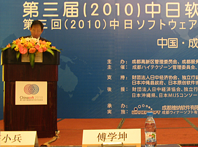 産業大会の冒頭、高新区のハイテクゾーン管理委員会の傅学坤副主任が挨拶し、「成都市を中心とした高新区のソフト・アウトソーシング売上高は、300億円に達した。ITベンダーは約400社に達し、成都市内だけで60%を占める。日本のITベンダーも70社が進出している」と述べ、中日関係が同地区の発展に欠かせず、協力関係をさらに強化したい考えを示した。