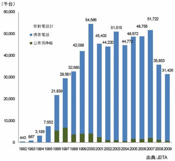 移動電話(携帯電話およびPHS)の国内出荷台数推移(年度)