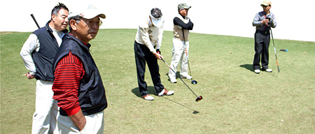 「中島杯」は、前半戦と後半戦ともに、最初に代表者が7番アイアンで打ってからスタートすることが恒例になっている。今回は、前回優勝者であるハイパーマーケティングの谷正行社長(ピンク)と準優勝だったコーレルの堺和夫社長が打者を務めた。ほかのプレーヤーは、両者が打った距離を越えなければペナルティーが待っている