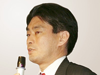 | 販社向けのイベントで戦略を語る佐々木賢一社長 |