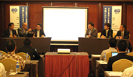 パネラーは、マイクロソフトチャイナの原義弘日系企業担当BDMジャパンディレクター、クオリティソフト上海の飯島邦夫総経理、大塚商会上海の岩宮宏総経理のITメーカーとSIerの代表者に、中国の現地法人/ユーザー代表としてリコー中国の中島崇信息系統部副総経理と三洋電機中国の廣瀬英樹IS推進室室長が加わり、議論を展開した。モデレーターは週刊BCN編集長の谷畑良胤が務めた。(谷畑良胤)