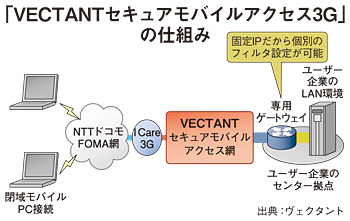 「VECTANTセキュアモバイルアクセス3G」は、MVNE(MVNOの支援事業者)の日本通信が法人向けデータ通信サービスとして提供している「I・Care3G」と閉域接続することにより、「FOMAハイスピードエリア」で下り最大7.2Mbps、上り最大2.0Mbpsと高速通信で社内ネットワークに接続可能なモバイルVPNサービスである。例えばユーザー企業の営業担当者は、外出先などでオフィスのデスクで業務するのと同様に社内ネットワークにアクセスできる。利用料金は定額制を採用しており、月額で1端末あたり5500円。ほかに、初期費用でUSBタイプの端末が1万4200円、事務手数料5600円/端末が必要となる。
