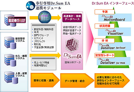 連携にあたっては、データ連携フレームワーク「奉行専用Dr.Sum EA連携モジュール」を利用することで、ノンプログラミングで「奉行V ERP」のデータを「Dr.Sum EA」と連携できる。なお、「奉行専用Dr.Sum EA連携モジュール」は、全国のOBC販売パートナーを通じて6月3日から提供開始している。