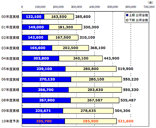 09年度の全出荷台数は、前年度比5.8%減の50万4306台となった。上期は前年同期比15.8%減と大幅マイナスだったものの、下期は4.1%増とプラス成長し、上期のマイナスを補った。「昨年末の段階では45万台程度に落ちる可能性があると思ったが、下期の回復で何とか50万台に乗った」(伊嶋社長)。下期の好調要因は、ネットサービス系企業のサーバー増設と、医療・金融分野での需要増としている。