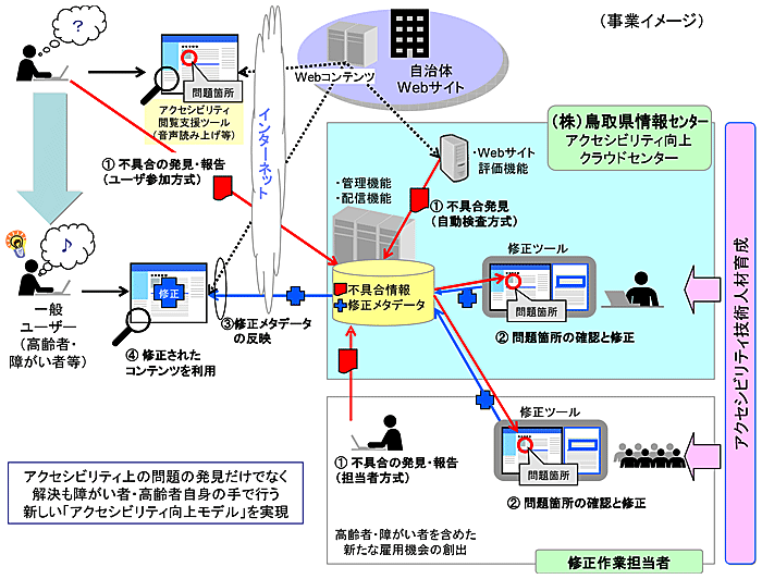 「Webアクセシビリティ・クラウドセンター」は、TICデータセンターに新設して運用する。TICは、障がい者と共同で「アクセシビリティ向上システム」のツールを活用して補助情報作成業務を行う人材の育成に着手し、障がい者や高齢者の新たな知識・ノウハウの習得や雇用機会の創出に取り組む。