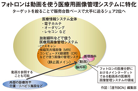 フォトロンメディカルは、動画管理システムに特化した事業戦略が奏功。2007年のフォトロン本体から分社独立して以降、営業利益が年率およそ2倍ずつ伸びるなど好調に推移している。今後は、eラーニングなどの商材を加えていくことで、向こう3年で直近の約2倍に相当する「10億円の売り上げを目指す」(同)と、意気込む。(安藤章司)