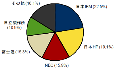 ベンダー別順位は、日本IBMが2年ぶりに首位に返り咲いた。メインフレームとx86サーバーの好調が要因だ。2位以下は日本HP、NEC、富士通、日立製作所の順。