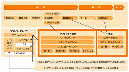 ビジネスプロセスアウトソーシング沖縄テクニカルセンターは、組み込み開発・検証業務に特化した拠点。組み込み開発市場の規模が拡大するなか、「海外オフショア」でコスト高やリスクとなる機器調達やテスト環境、機材輸出入、運送コストなどを、「ニアショア」である沖縄で提供することで、顧客の不安を解消できるとしている。