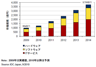 IDC Japanが定義するプライベートクラウドとは、個別企業または企業グループのみが利用可能なITの利用形式、またはそこで提供されるサービス。09年の市場規模は984億円で、10年は前年比26.0%増の1240億円とみた。また、09年~14年までの年間平均成長率(CAGR)は30.7%とし、14年の市場規模は3759億円と予測した。
