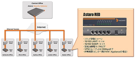 「Astaro RED」は、VPN回線接続の専用機器。「ASG」を中央に置き、拠点に「Astaro RED」を置くことで、拠点でのセキュリティポリシーの一括管理を実現する。「ASG」は、ソフトウェア、バーチャルアプライアンス、ハードウェアアプライアンスから選択できる。