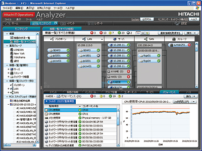 もう一つの「Hitachi IT Operations Analyzer」は、情報システムでサーバーやネットワーク機器、ストレージがどのようにつながっているかなど、構成を自動把握して稼働状況を管理するソフト。09年4月から海外市場に限って販売している製品で、今回の新シリーズ立ち上げを機に、日本市場でも発売した。情報システムの構成を自動的に図式化して管理画面で表示する独自技術と、障害発生時の対策機能「RCA」を特徴にした。「RCA」は、トラブルが起きた時に障害が発生している機器を特定して管理者に通知するだけでなく、想定する原因を列挙して知らせる。価格は10ライセンスで25万2000円、サポートサービスは同年間6万3000円。