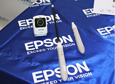 ELPIU02 「EB-900T」は、電子黒板ユニット「ELPIU02」をセットすると、投写面上で、付属の電子ペンをマウスとして使用するPC操作や、文字や図形の書き込みなどができる。実勢価格は21万円台後半の見込み。「ELPIU02」単体の実勢価格は9万円台後半の見込み。