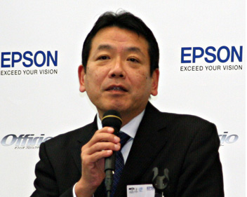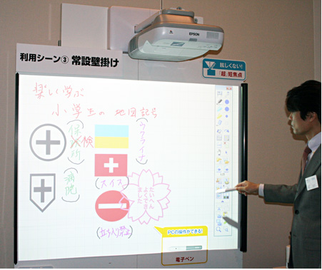 エプソン販売の中野修義取締役 発表会でエプソン販売の中野修義・取締役 販売推進部長は、「プロジェクターは黒板サイズに投影でき、すべての生徒が見やすい。また、持ち運んで使うことができるので、テレビよりも学校で使う大画面装置として適している。当社は、見るだけの大画面ではなく、使うことのできる電子黒板をプロジェクターで提案し、教育の情報化――ICT化をサポートしていく。新製品の電子黒板機能内蔵モデルとしては、壁掛けタイプと既存のプロジェクターにセットするユニットタイプを用意した。予算や環境に合わせて選んでほしい」と語った。