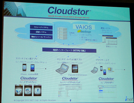 SIerのアイネット(梶本繁昌社長)は、12月14日、自社で展開するプライベートクラウドサービス「VAiOS」上で、オープンソースソフトウェア(OSS)のHadoopで構築したオンラインストレージサービス「Cloudstor」を2011年2月から提供開始すると発表した。