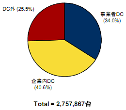 調査によると、国内のサーバー設置台数の合計は275万7867台で、そのうちデータセンター事業者が設置するサーバーが全体の34.0%にあたる93万6502台、ユーザー企業のデータセンターにあるサーバーが40.6%の111万8913台とした。