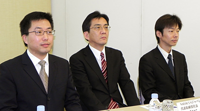 日本法人設立の説明会に出席したNSFOCUSの幹部。中国本社の呉云坤副社長(左)と日本法人NSFOCUSジャパンの栗原章通社長(中央)。 主力製品は、ネットワーク上で特定サイトに飽和攻撃を行うDDoS攻撃や不正侵入、データ漏洩を食い止める製品群。アプライアンス方式などで製品化した。NSFOCUSは、脆弱性の診断、具体的な防御システムの導入、運用に至るネットワークセキュリティをワンストップで提供できるのが強み。販売などを担うビジネスパートナーは、京セラコミュニケーションシステム(KCCS)や日本ユニシス、ネットワールド、ソフィア総合研究所、インフィニテックなど。(安藤 章司)