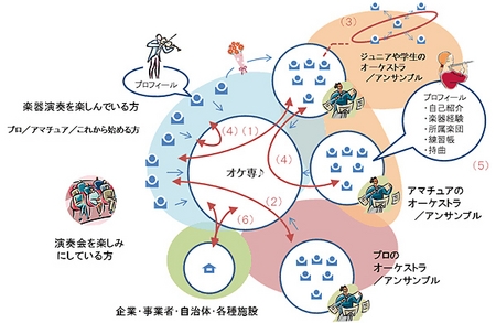 「オケ専♪」のシステム概要。(1)メンバー募集(2)演奏会情報(3)スケジュール共有や雑談など楽団内のコミュニケーション(4)テーマごとのコミュニケーション/練習帳・持ち曲を介したコミュニケーション(5)プロフィール(6)出店/広告