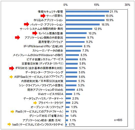 2010年度と2011年度の新規・追加投資の主要分野の調査によると、サーバーの仮想化とモバイル環境の整備に対するニーズが拡大するほか、アプリケーションへの投資が再開する傾向。とくに従業員数2000人以上の大企業でのニーズの高まりが鮮明に表れ、IFRS対応や運用管理ソフトウェアへの投資意欲も高まっているという。