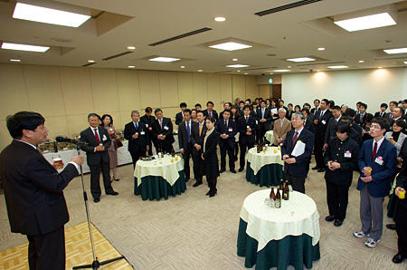 懇親会は「BCN ITジュニア賞」の生みの親の一人である和歌山県立田辺工業高等学校の元校長・平松芳民氏の挨拶で始まり、高校プロコンを主催している全国情報技術教育研究会の金子正明会長(埼玉県立熊谷工業高校校長)にもご挨拶をいただいた。乾杯の音頭は協賛企業代表としてジョルダンの佐藤俊和社長が務め、約70人の参加者を得て懇親会がスタートした。