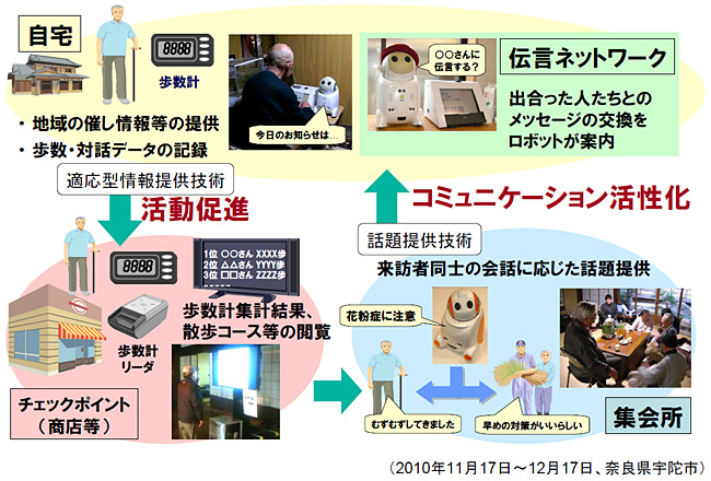 2010年11月17日~12月17日、奈良県宇陀市の10個人宅と5施設に、個人向けの情報を提供するロボットや外出記録機器(チェックポイント)、居合わせた人同士の会話を促進する話題提供ロボットを設置した。