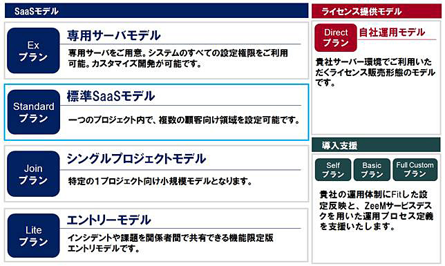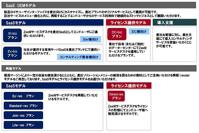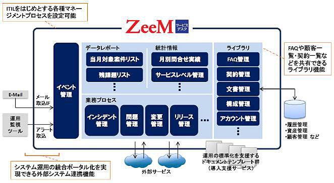 「ZeeM サービスデスク」フルリニューアル版は、情報システム部門のITサービス管理業務をサポートするクラウド型ITサービス管理ソリューション。ITIL(Information Technology Infrastructure Library)をはじめとする各種マネジメントプロセスを設定できるようになったほか、システム運用の統合ポータル化を可能にする外部システムとの連携機能、FAQや顧客一覧・契約一覧などを共有できるライブラリ機能を強化した。